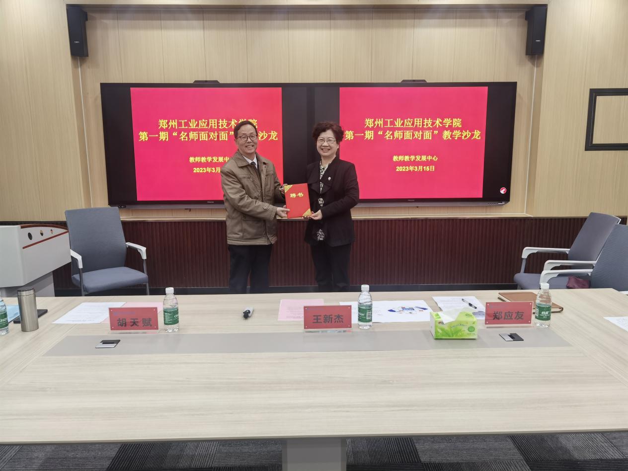 活动中,副校长王新杰教授为胡天赋教授颁发了我校“教师教学发展特聘专家”聘书,并作了第一期“名师面对面”教学沙龙开班讲话。她表示,青年教师是支撑我校未来可持续发展的骨干力量,很高兴看到青年教师积极参与到教学沙龙活动中,并就自身职业发展、教学能力提升等问题进行交流和探讨,希望与会教师在做好本职工作的同时,积极利用各种平台努力提升专业能力,逐步发展成长为骨干教师、教学名师,实现个人成长与学校发展的双赢。