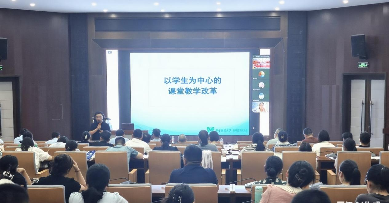 本次培训主要聚焦于以学生为中心的课堂教学改革,从理念、过程、行为和实践等方面阐述如何实现从“教学范式”到“学习范式”的转变。张教授首先阐释“以学生为中心”教育理念的内涵,提出要以立德树人为目标,高度聚焦学生学习及效果。接着从学生如何“学”、教师如何“教”、教学管理层如何“管”、学校决策层如何“变”四个维度,分享构建“以学生为中心”的人才培养模式改革路径,提出要健全教育教学质量保障体系,形成持续改进的质量文化。强调课堂教学改革的关键在于有效评估学生学习成果,从学生层面、课程层面、专业层面、学校层面分析高校学生学习成果评估的逻辑与层次,并以“华中科技大学本科生学习与发展问卷调查”和“基于学生学习效果的高校教师教学投入问卷调查”的调查问卷开发及调查系统设计,讲述如何有效评估大学生的学习成果与教育增值影响。最后探讨了在当前人工智能技术背景下,如何通过线上线下混合式教学和智慧教室的应用,实现从“传统课堂”到“智慧课堂”的过渡。
