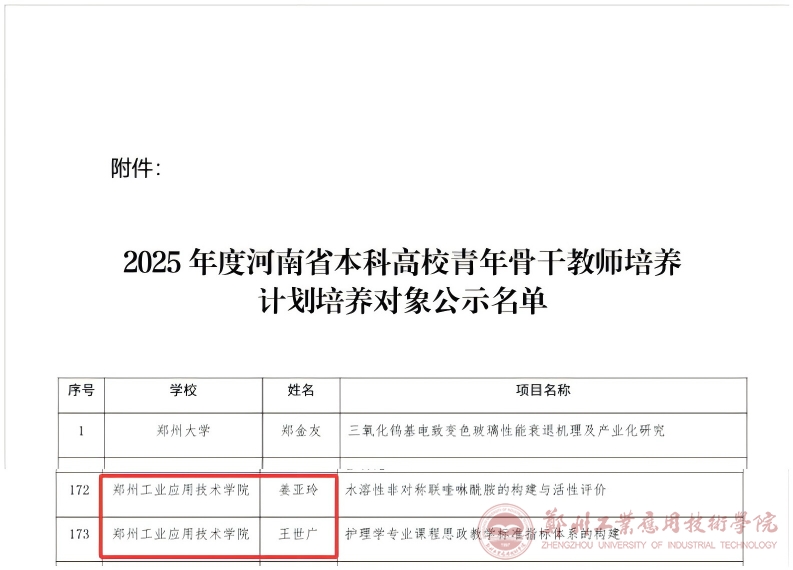 近日,河南省教育厅发布《关于公布2025年度河南省本科高校青年骨干教师培养计划人选名单的通知》,我校王世广、姜亚玲两位教师经学校推荐、省教育厅专家评审及公示后,成功入选,不仅体现了我校教师的良好素养与发展潜力,更彰显了学校在申报工作中精细化筹备、高质量打磨的扎实成效。未来,学校将继续以各类高层次人才项目为抓手,做好申报服务与支持工作,助力教师成长发展,为学校教育教学质量提升注入更强动力。