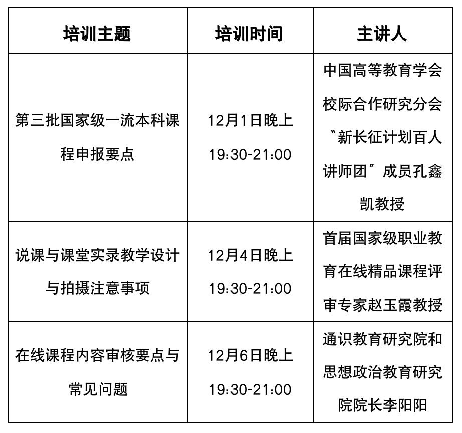 为帮助我校教师深入了解第三批国家级一流本科课程申报要点及申报过程中的相关注意事项,教师教学发展中心将借助超星教师发展直播讲堂平台开展课程申报指导系列培训,现将本次培训有关事项通知如下: