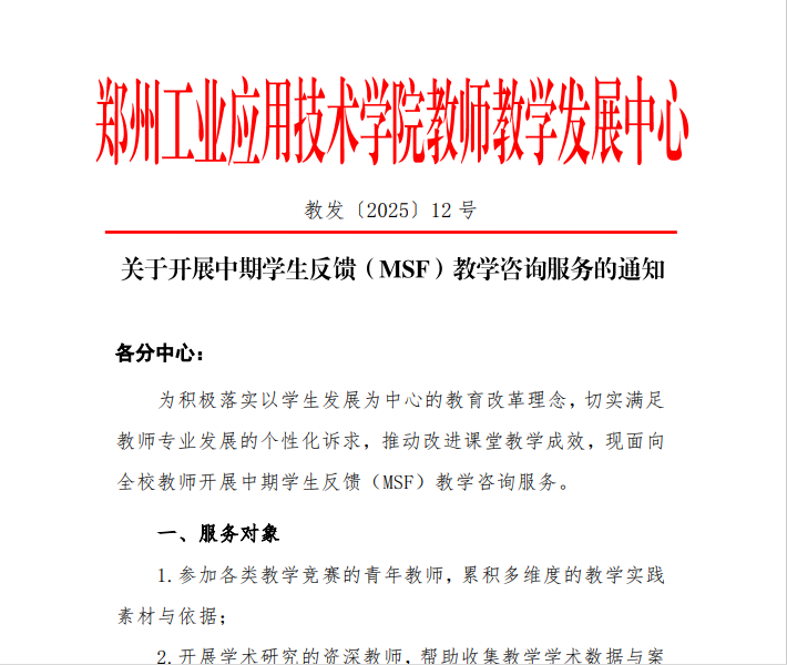 近日,教师教学发展中心圆满完成我校首期“中期学生反馈”(MSF)教学咨询服务。本期活动为期6周,是针对教师个性化需求定制的过程性教学咨询项目,旨在践行“以学生为中心”理念,切实发挥教学咨询在教学过程中的观测与反馈效能。